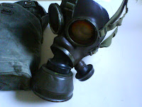 Civil PDF-DA gasmask. This one comes with a cloth bag and elastic fabric headharness. Later ones were made of full rubber. Early type of exhale valve.
